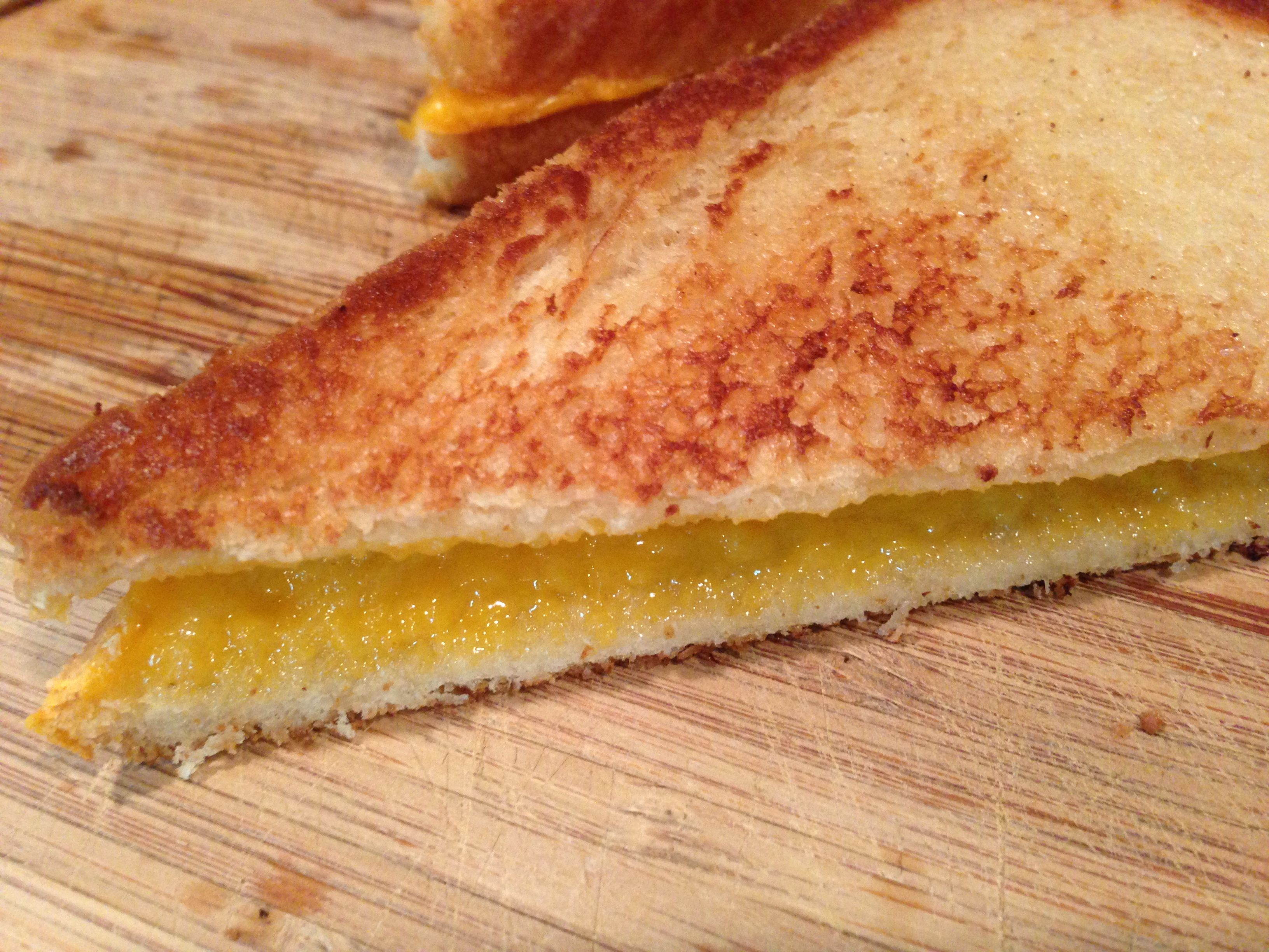 This isn’t even really a recipe, which I regard as a solved puzzle detailing ingredients and how to use them. This is simply a set of directions about how to make the standard grilled-cheese more yummy. Of course the secret is butter and making sure it gets cooked properly, so the end result is a soft and crunch, melty-on-the-inside sandwich. This is by no means health food. I am not recommending it for anyone. I’m just saying if you’re going to make something, you might as well as make it delicious. And doing that, with the exception of pulling fresh produce from a tree or vine, means adding fat, salt or sugar. With that disclaimer out of the way, I willl go on: