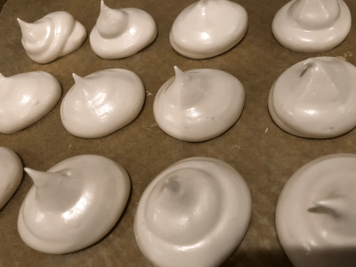 I love meringues because once you get the hang of it, they’re pretty easy to get right, and they can literally be whipped up pretty quickly (even though they take a while to finish). For a dessert, they’re relatively low-calorie, they’re naturally gluten-free and people can eat lots of them. You can’t say that about too many cookies, and definitely not for any desserts I make. There is nothing wrong with a plain meringue but I find I like to add more vanilla than is traditional (1 tablespoon vs. 1-2 teaspoons) and other stuff, usually coffee flavor or syrup. For syrup I use Dave’s Coffee syrup, which is fantastic. Again, you can flavor them however you like but remember; add the flavor after you have gotten some foaming in your mixer. Don’t try without electric beaters or a stand mixer, your wrists will never be the same. Lastly don’t forget to add the salt!